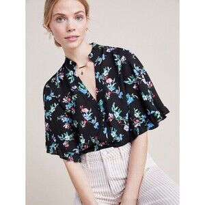 The Anthropologie Maeve Aveiro Flutter Sleeve Button Down Blouse in small size is a stylish and versatile top for women. This black blouse features a floral pattern with 3/4 flutter sleeves and a collared neckline, making it a trendy and feminine option for everyday wear. Made of viscose fabric, this blouse is lightweight and suitable for all seasons, adding a touch of bohemian flair to any outfit with its colorful and flower-themed design.