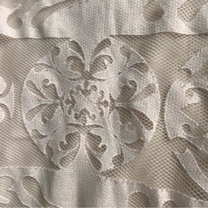Good used condition. Capriccio Lace Top by Anthropologie brand Meadow Rue in Ivory, a cream/off-white shade. Bohemian romantic art-to-wear aesthetic, a versatile piece that can be dressed up or worn casually. Lightweight slub jersey tunic top with 3/4 sleeves and round neckline. Lace mesh paisley panel at front with raw fabric trim at neckline, see video. Note: moderate wear throughout, with faint discoloration at back and light piling, see photos. Size medium, see photos for measurements.