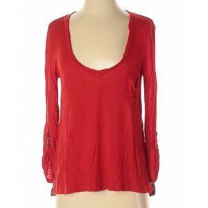 Anthropologie Porridge Whimsical Backstory Top size XS V-neck 3/4 length sleeves with roll tab High low hem Red knit front with chest pocket with print chiffon on back 100% rayon Great condition Dry clean only 28" Chest, 25" Length