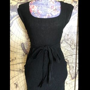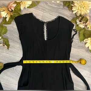 Abbey jumpsuit by Anthropologie. Gauzy black jumpsuit with cap sleeves and keyhole back. Back hidden zip. Cropped jumpsuit with figure flattering waist tie and pockets!