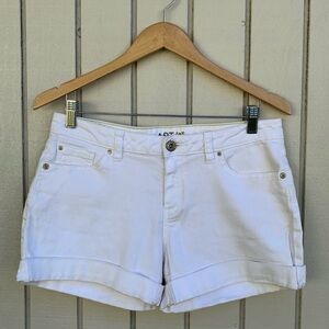 These white jean shorts from Apt. 9 offer a casual and versatile style, perfect for warm weather. Made from lightweight denim, they feature a cuffed hem for a relaxed look. Ideal for summer outings, these shorts combine comfort with a classic design. This is a great pair of shorts in great condition. They are classic cut with a cuff.