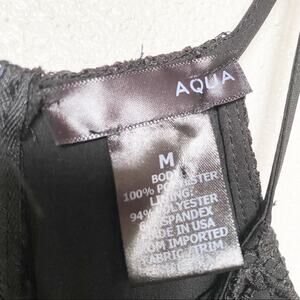 Sleeveless black lace romper from Aqua. Pull on the hem. Zipper closure at the back.
