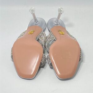 These metallic mules boast a twisted crystal-embellished vamp with a PVC trumpet heel.