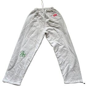 Archive Bold 939 sweatpants, light gray, green logo, heavyweight cotton, elastic waistband, elastic toggle ankle cuffs, medium, waist flat: 12-17", rise: 14", inseam: 28", gently used, no visible flaws