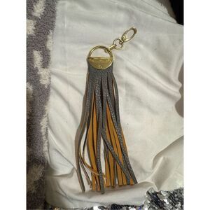 Grey/tan leather fringe keychain-bag charm goldtone hardware w/signature - logo