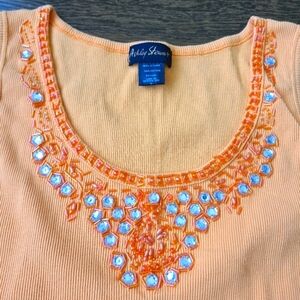 Elevate your style with this vibrant orange top from Ashley Stewart. Featuring intricate embellishments, it's perfect for any occasion. Excellent condition.