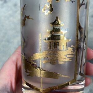 Asian Gold Leaf Frosted High Ball Glasses Pagoda Lotus Tree Cocktail
