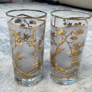 Asian Gold Leaf Frosted High Ball Glasses Pagoda Lotus Tree Cocktail Set of 2