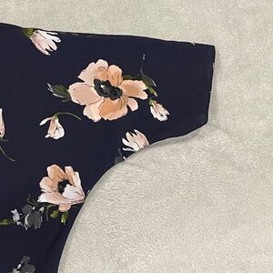 Dark navy blue with a pale pink and ivory Japanese floral print. It a lightweight, open draping cardigan, perfect for every season.