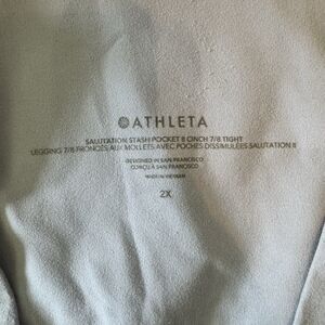 The Athleta Salutation Stash Pocket II Cinch 7/8 Leggings in size 2X XXL are versatile and stylish leggings designed for women. Made from a comfortable fabric wash in medium, these leggings feature a convenient stash pocket for added functionality. The gray color with blue accents adds a pop of color to any outfit, making them a great addition to any wardrobe. Perfect for workouts or casual wear, these leggings combine fashion and practicality effortlessly.