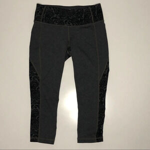 Athleta Cropped Leggings. Gray with a black paisley design on the waist and sides. These leggings have a thicker material. One small pocket for keys or card entry.
