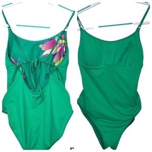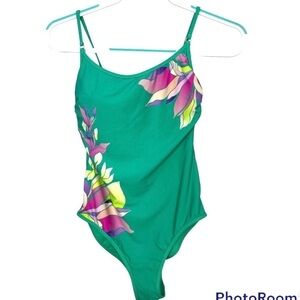 Athleta Teal Vintage Floral Hawaiian Green Pink One Piece Strappy Swimsuit
