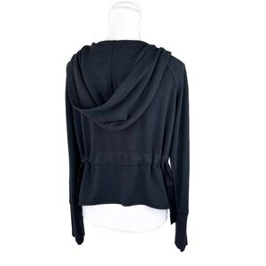 Athleta hoodie open sweatshirt jacket black. Open front. Rear sash can cinch and tie in back. Unless your waist is very small, sash will not reach to tie in the front. Pockets! Long sleeves. Ribbed cuffs. Soft, stretchy knit is modal/poly/spandex blend. A perfect piece to go over workout clothes or with a t-shirt and jeans. Great used condition: some minor overall fuzziness, but no stains or holes.