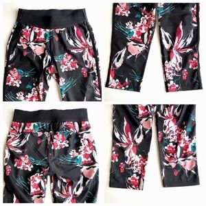Athleta x Derek Lam 10C Lily Chelsea Capri crop Leggings in black with multicolor floral.  Wide ribbed elastic waistband.   Grosgrain trim down sides.  Breathable.  Quick drying.  Lightweight.  Performance-fitted.  Mid-rise, tight leg.  Capri length.  Approx. 17.5” inseam, 8” rise and 25” elasticized waist.  Worn but in excellent condition with no visible signs of wear.