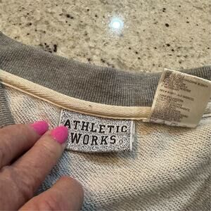 The Athletic Works sweatshirt is a men's pullover in size large, featuring a sleeveless design with embroidery. It comes in gray with a graphic print pattern and is made from a blend of cotton and polyester. The knit fabric and crew neck style make it suitable for fall. This vintage piece is machine washable and was manufactured in China. The sweatshirt is pre-owned.