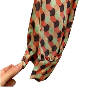 This Attic and Barn dress is giving major mod moment vibes! Featuring a bold geometric wave print in shades of coral, mint, tan, and black, this silky button-down dress brings vintage flair with a modern twist. The high neck and gathered cuffs add structure, while the relaxed silhouette keeps it effortlessly chic.
