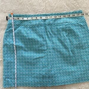 Freshen up your wardrobe with this chic Attyre Teal Geometric Pencil Skort in size 10. Features a classic pencil silhouette with the comfort of built-in shorts, making it stylish yet practical. The teal and blue geometric print adds a modern touch, perfect for pairing with solid tops for both casual and dressy looks.