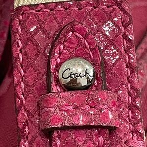 Authentic coach python signature jacquard leather fuchsia magenta cross-body swingpack shoulder women's bag, features top zip closure, silver tone hardware, front slip pocket with faux turn-lock, canvas crossbody strap, coach hang tag. Interior is lined with light pink sateen and has a coach patch with serial number. . Note: all measurements are +/-2 inches. Preowned bag with normal signs of use. Clean inside and no tear or rip. Please enlarge pictures to see details. Pictures are important part of the description. Sold as seen in the pictures.