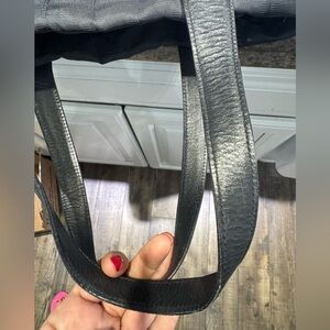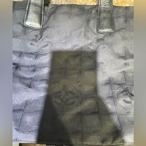 Authentic CHANEL bag USED in black color w/ original duster bag included.  Bag is material with leather straps.  Inside are two large pockets with zipper.