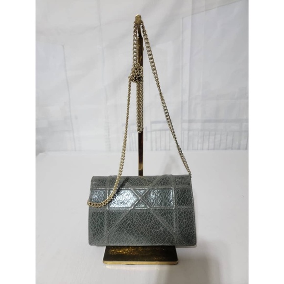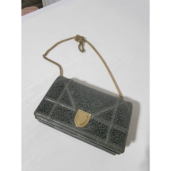 This authentic Christian dior Crinkled Metallic Brushed Calfskin Diorama Wallet on Chain Pouch Shoulder/Crossbody Bag Sage Green is in it’s good pre-owned condition. The exterior leather is clean and beautiful . Interior is clean. There is a little stain on one side of the back exterior, it is not obvious (Kindly look at the pictures for more details). Gold hardware.