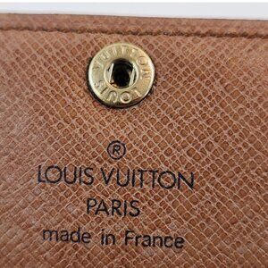 Authentic Louis Vuitton brown monogram 4 hook key case. Made in France this case is preowned and as such shows signs of wear including exterior rubbing, scuffing, scratches top corners, peeling, fading, tarnishing to exterior/interior. Interior has scratches, stains partially, rubbing, peeling scuffing and tarnishing to hardware. See all photos for more details. Size is Approximately  Width 4inch (10cm) x Height 2inch (5cm) X Depth 0.39inch (1cm).