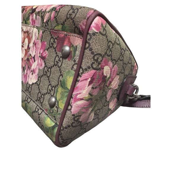 Gucci GG Blooms Boston Bag, a beautiful mix of iconic monogram canvas and romantic floral design. Featuring the model number 409529 / 525040, this mini Boston silhouette is crafted in GG Supreme coated canvas with a vibrant Blooms print and pink leather trim. A must-have for Gucci lovers and collectors alike.