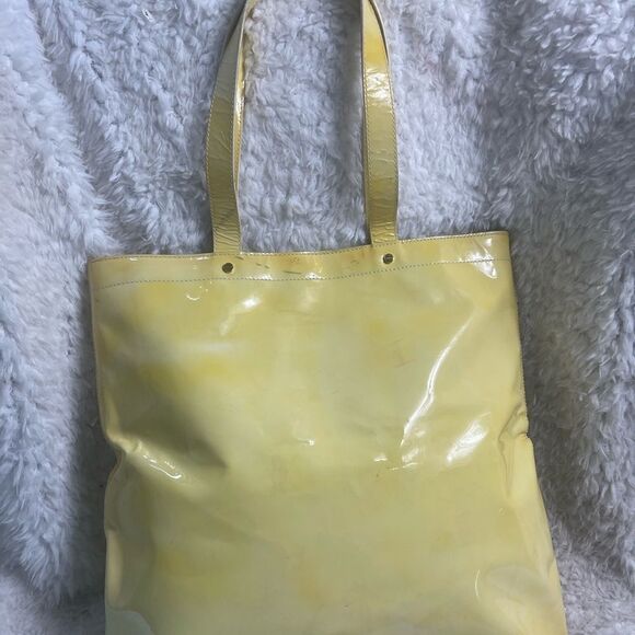 Authenticated Tory Burch leather patent yellow Large tote with dust bag .top snap closure the inside lining has a side zipper and a side pocket.pre owned in good used condition the bag has some faded spots on the yellow and some transfer marks as well see all pictures any questions please message.