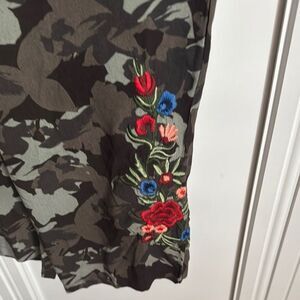 These camo pull on pants feature a relaxed fit with a tapered ankle, perfect for comfort and style. The vibrant floral embroidery adds a bold accent, making them a standout piece. Crafted from soft fabric, they are ideal for casual wear.
