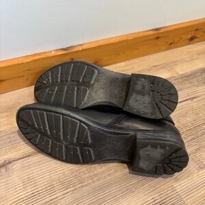 Zip up the inside of the ankle. Buckle detail. Low heel. Rounded toe. Slouchy style.
