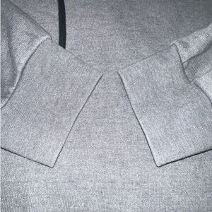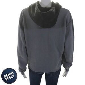Stylish gray hoodie with black hood. Features colorful logo on chest. Comfortable and trendy.