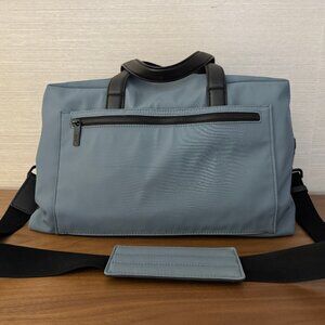 Stylish travel bag by Away. Features a sleek blue exterior. Black handles and strap for easy carrying. Front zip pocket for quick access.