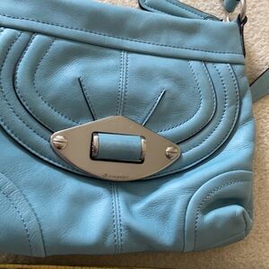 Beautiful very soft leather cross body bag in Nice blue color, outside zipper pocket with CC and ID compartments, zipper on top with more pockets with signature animal print lining
