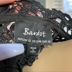 BARDOT Sheath Dress with Lattice panels on the bodice add a flirty touch to this mock neck lace constructed dress.
