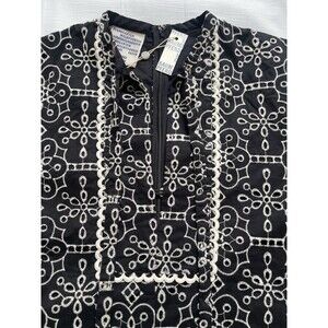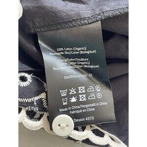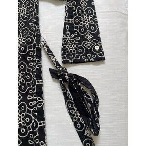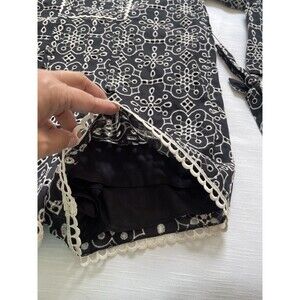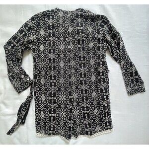 This dressy but casual beautiful romper comes in a lightweight non-stretch embroidery fabric with a black background and cream stitching. Neckline with deep V with button and tie, long unlined sleeves with button cuff and sash at waist. Made of 100% cotton and fully lined except for arms. Size 32, which equals to an XX small, US 0. A generous size 0 with approximate measurements being a 20 inch chest, 21 1/2 inch arms and is 31 inches in total length. Brand new with tags. Comes from a smoke-free home. Retail cost $309