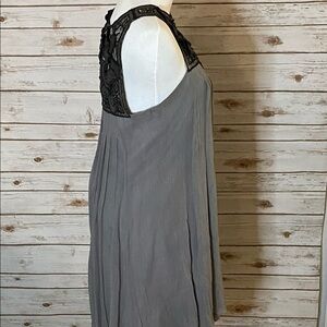 Grey w/ black and gold appliqué top; sleeveless; flowy silhouette; hidden back zipper; fully lined