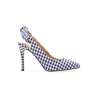 A knotted bow crowns the slingback strap of a pointy-toe pump with a lightly cushioned footbed.