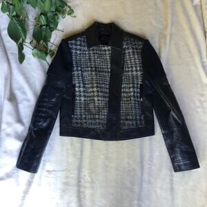 In good preowned condition. Faux leather with fabric paneled. Dark navy. Asymmetric zipper details.