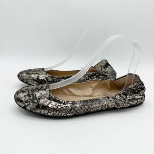 Women's BCBG Paris Magie Nappa leather pewter and black snakeskin print slip-on ballet flats, so cute flexible ladies ballet flats foiding shoes fold up ballet. Great for stashing in your bag while wearing boots or too high heels. Trending metallic accent.
