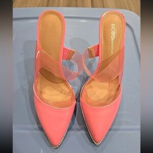 These BCBGeneration heels feature a striking pink hue and a sleek, modern design. With a pointed toe and open-back mule style, they offer a minimalist elegance perfect for making a bold fashion statement. The medium-height stiletto heel adds a touch of sophistication to any outfit. Use only a few hours.