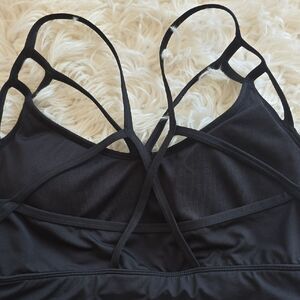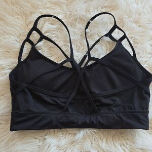 Sleek black sports bra with double straps. Ideal for active wear. Size Large. Like new conditon. Has removable bra pads. Strappy details. This bra is really cute.