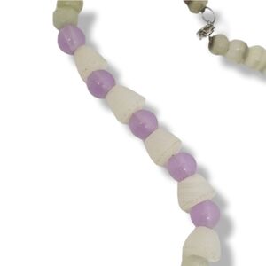 Beautiful vintage necklace made up of marbled alabaster stone beads with light greenish and yellowish hues and round purple glass beads. The colors of the alabaster is so lovely and the carved shapes of beads are unique. Necklace measures 23 inches in length with a spring clasp closure. Great condition.
