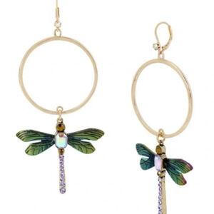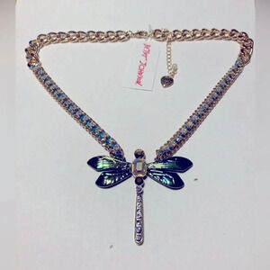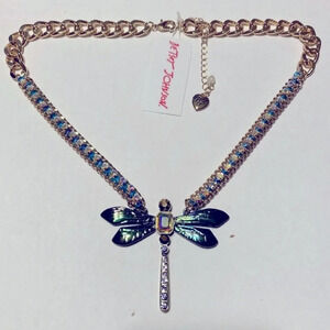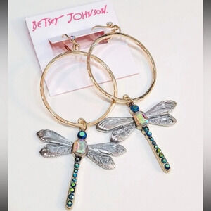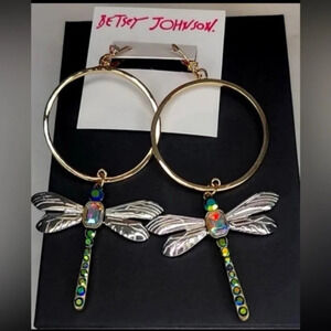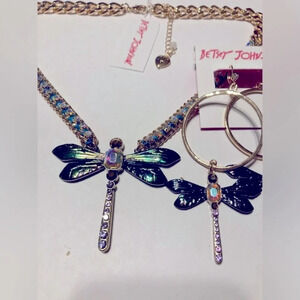 BETSEY JOHNSON SET Dangle Hoop Dragonfly Earrings & Matching Necklace with Aurora Borealis Crystals NEW NWT