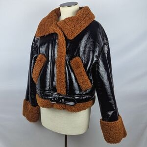 BLANK NYC Moto Jacket Vegan Patent Leather Faux Shearling Black Copper M NWT