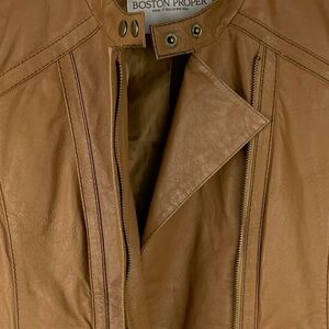 BOSTON PROPER LEATHER ASYMMETRIC ZIPPER STAND COLLAR TAN MOTO JACKET
