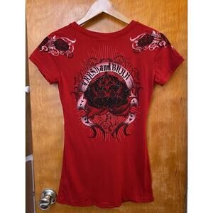 Black boxy tee with front and back graphics. Flames and tour dates on back. Very good preowned condition, no noted heavy wear or flaws.