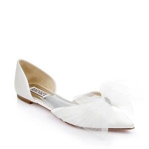 Elegant white flats by Badgley Mischka featuring a stylish bow detail. Perfect for adding a touch of sophistication to any outfit.