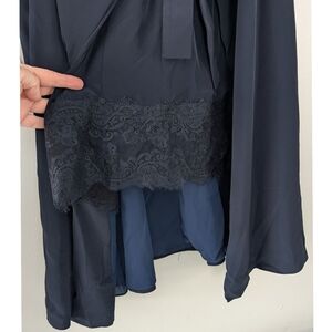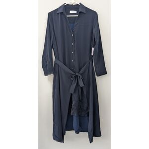 Elegant navy dress with button-down front. Features a stylish matching tie waist and built in lace trim exposed slip.