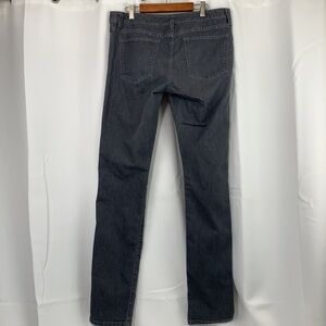Very good preowned condition. Soft denim with a slight stretch. Matching stitching. Contrast red stitching inside waist. Size 29. Color is lightest blue almost grey.