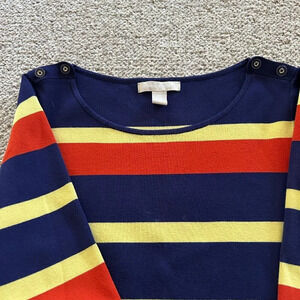 Step into timeless style with this Banana Republic striped sweater, perfect for adding a touch of Y2K preppy charm to your wardrobe. Featuring bold navy, orange, and yellow stripes, this sweater is both classic and eye-catching.