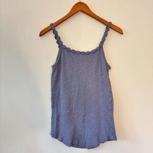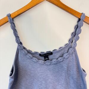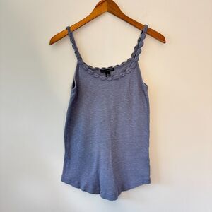 This Banana Republic tank top is a beautiful purple and must-have for your closet. The intricate floral crochet detailing along the neckline and shoulder straps adds a touch of boho elegance. The curved hemline adds a flattering touch to the overall design.